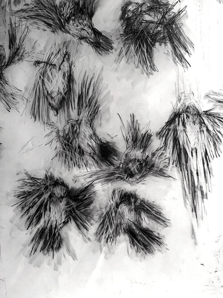 In Crashing Birds Murmuration #1, I flip the magic of a murmuration into an image that speaks to what happens when innocence is changed by trauma. The piece is simultaneously allegorical and also prescient as bird strikes are exponentially increasing at airports and in cities with skyscrapers. This moment of change – the strike – becomes the moment of impact. I wanted to capture that truth and how it’s different for each bird — some are stunned, some hurt, and some anticipate the collision and right themselves just in time. Some birds fly in ignorance of the window; some never fly in the same direction as others. I don’t draw the glass pane; the viewer can imagine its presence or not. I wanted to explore the physicality of this kind of looking at the world, not just its fatal consequences.