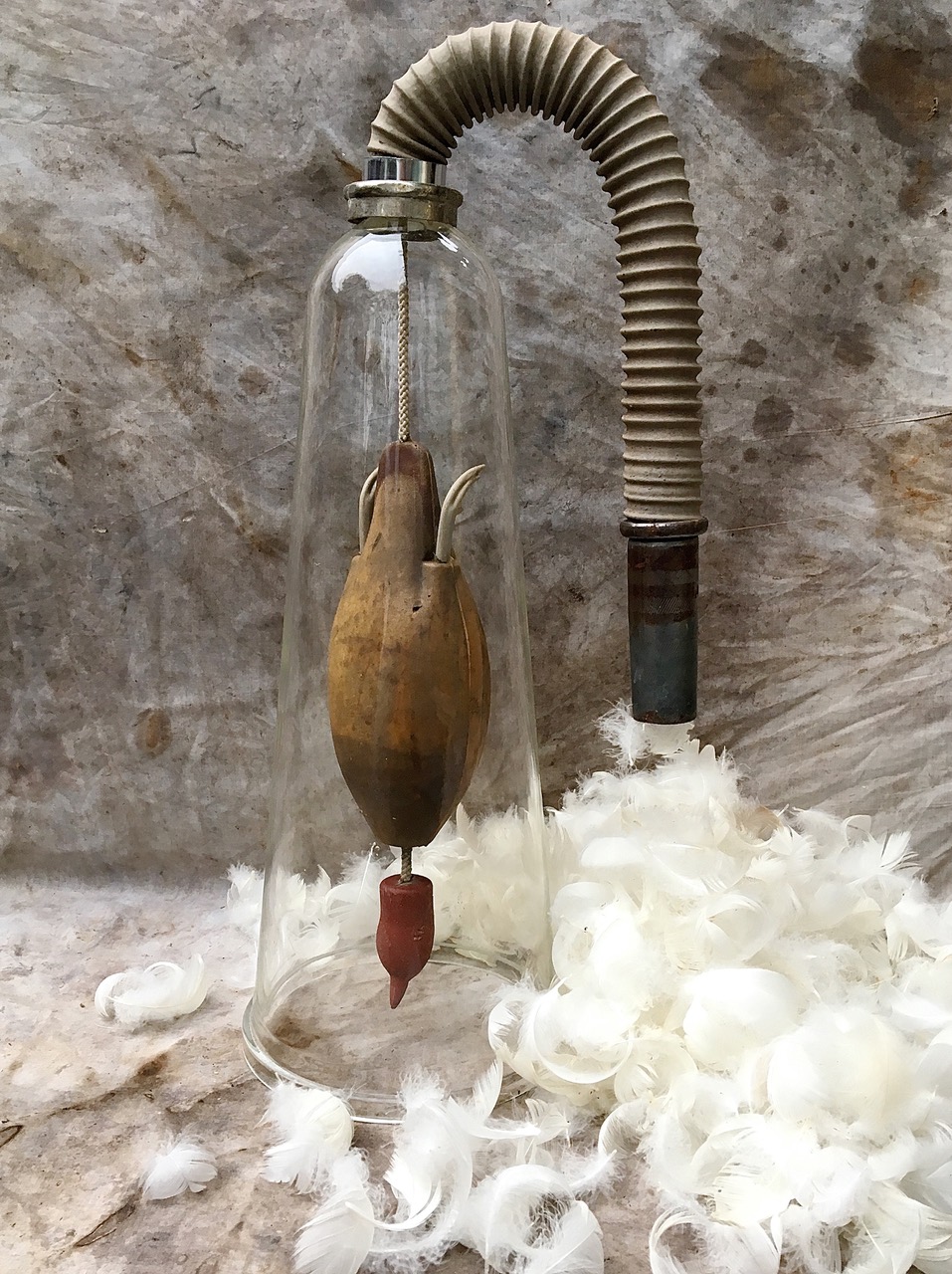 Savaged: glass cone, rubber bird, feathers, vacuum hose, fabric. 2023