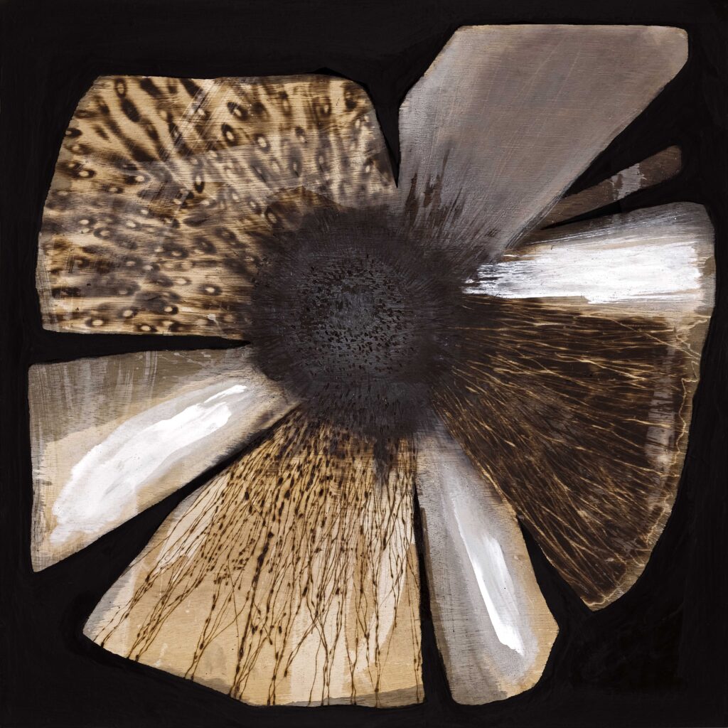 I made this work in the wake of the 2019/20 Australian bushfires which decimated my region on the eastern seaboard of the country and in which an estimated 3 billion native animals perished. Abstracted flora, created with fire itself, float above a charred landscape, a tribute to the resilience of the Australian bushland after fire.