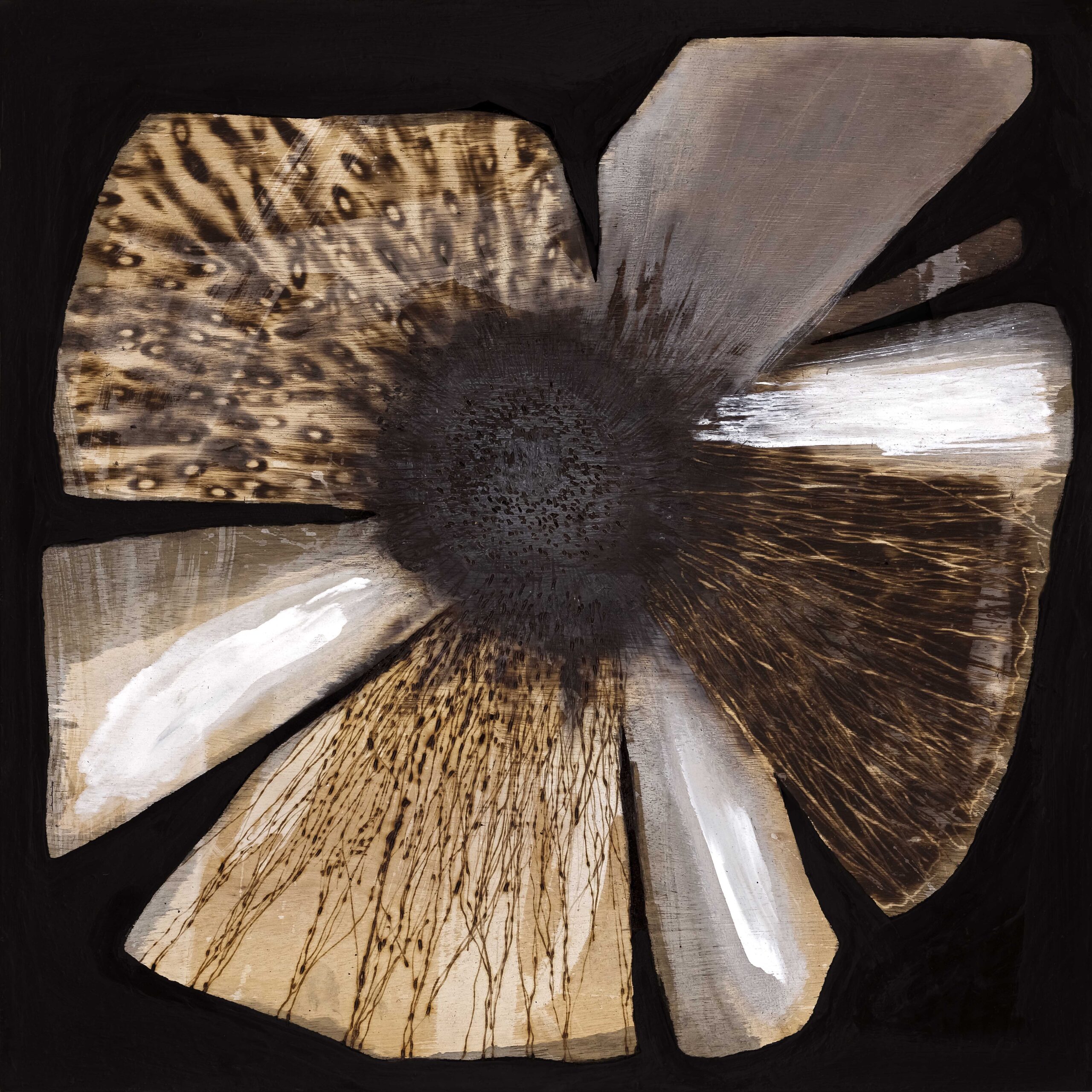 Wood stain, liming solution, acrylic, pokerwork, scorching on inscribed timber panels. 20’x20′