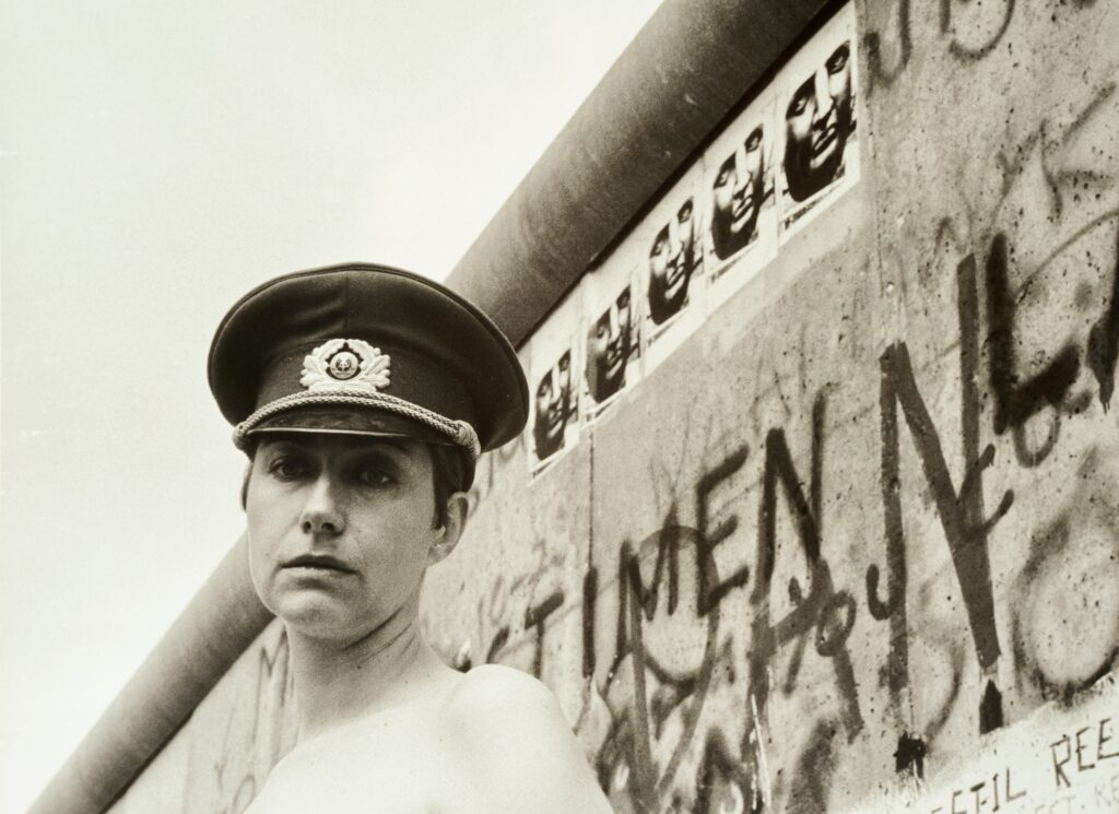 In my self-portrait, Walls Within: Berlin Wall, East Germany, I am wearing an East German military cap. This action was inspired by words an East German man shared with me: “Break down the enemy picture.” My bare shoulders suggest the vulnerability of the individual before the unrestrained power of a military police state.