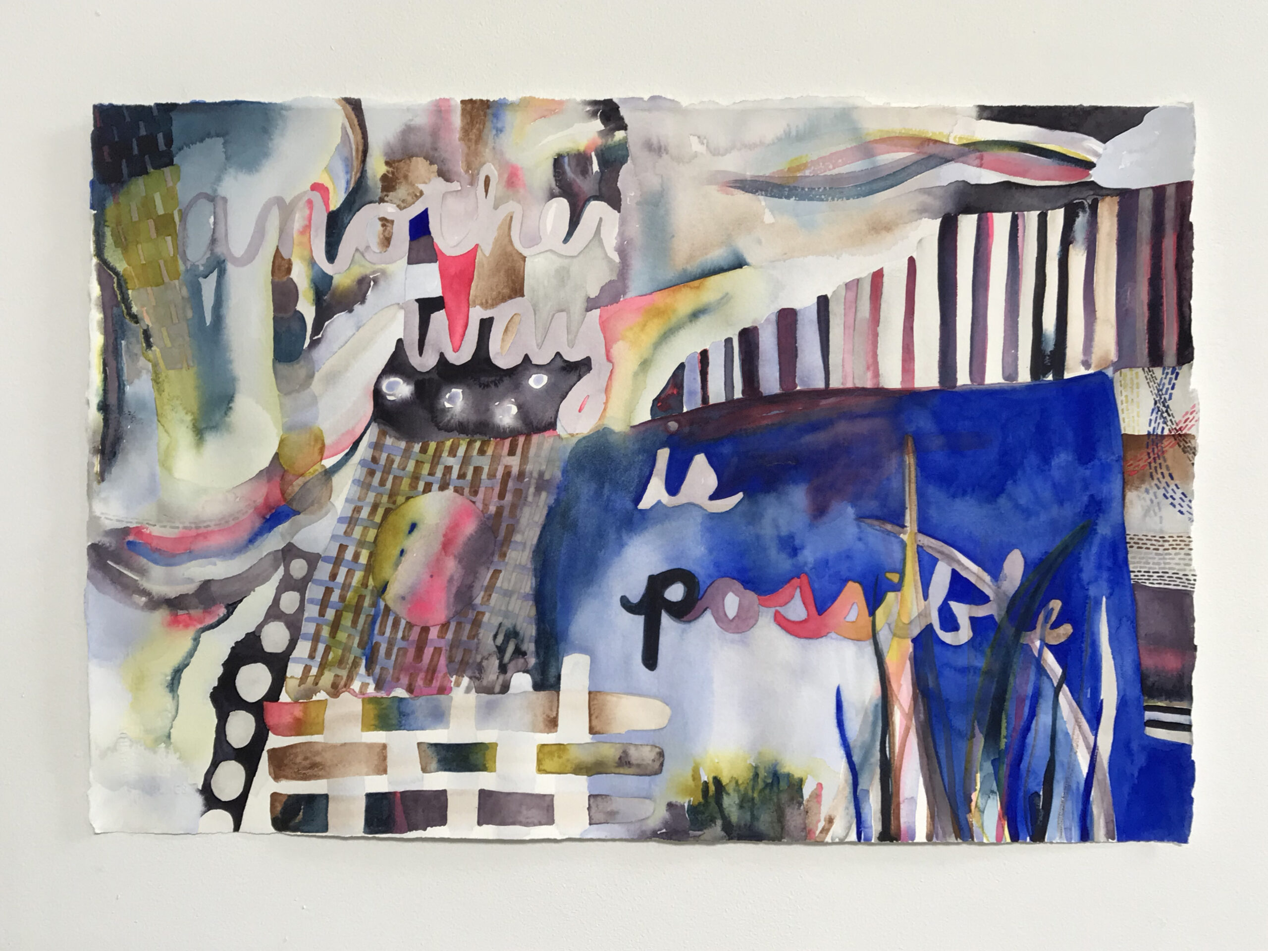 The current and looming impacts of the climate crisis have left so many of us anxious or depressed about the future. However, my art investigates what it could look or feel like to heal our ecological crises. I explore my hope through color, text and shape in my abstract watercolor painting. The palette is based on colors that correspond to how I aspire to feel about various aspects of living in society, including health, democracy, housing, ecological practices, and more. The phrase “another way is possible” adds specificity and conveys what I imagine and wish for ourselves and Earth. Formal elements that evoke threads and weaving nod to intersectionality and strengthening. Reaching for what it feels like to have a healed relationship with Earth is a way that I hope to offer an emotionally safe space for conversations about healing our ecological crises.