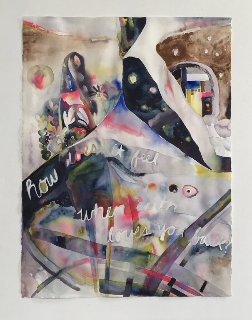 One of my goals with my artwork is to inspire change in imagination, perception and values around the climate crisis and our relationship with Earth. My intent with this piece is to move away from the shame that many of us feel when considering ecological crises, and instead to invite us to feel the unconditional love in our relationship with Earth as a starting point for healing. I chose the palette intentionally, as each color corresponds to how I aspire to feel about various aspects of living in society. In some areas I weave the colors of my palette together as a metaphor for the ways that what the colors represent – environment, health, racial justice, housing, and democracy – intersect and strengthen each other. I also include earthly imagery in the piece and work with watercolor as a further connection to Earth.