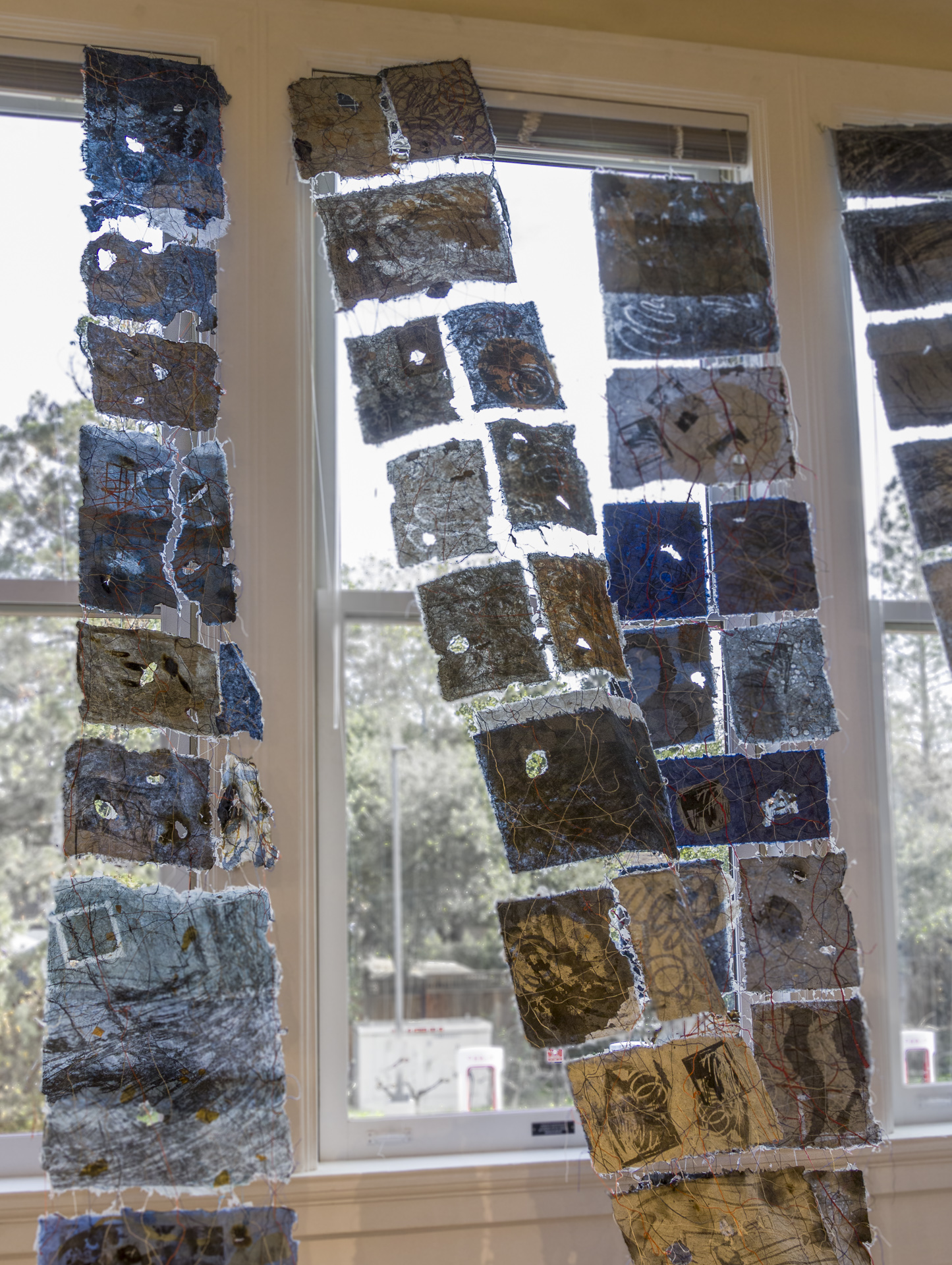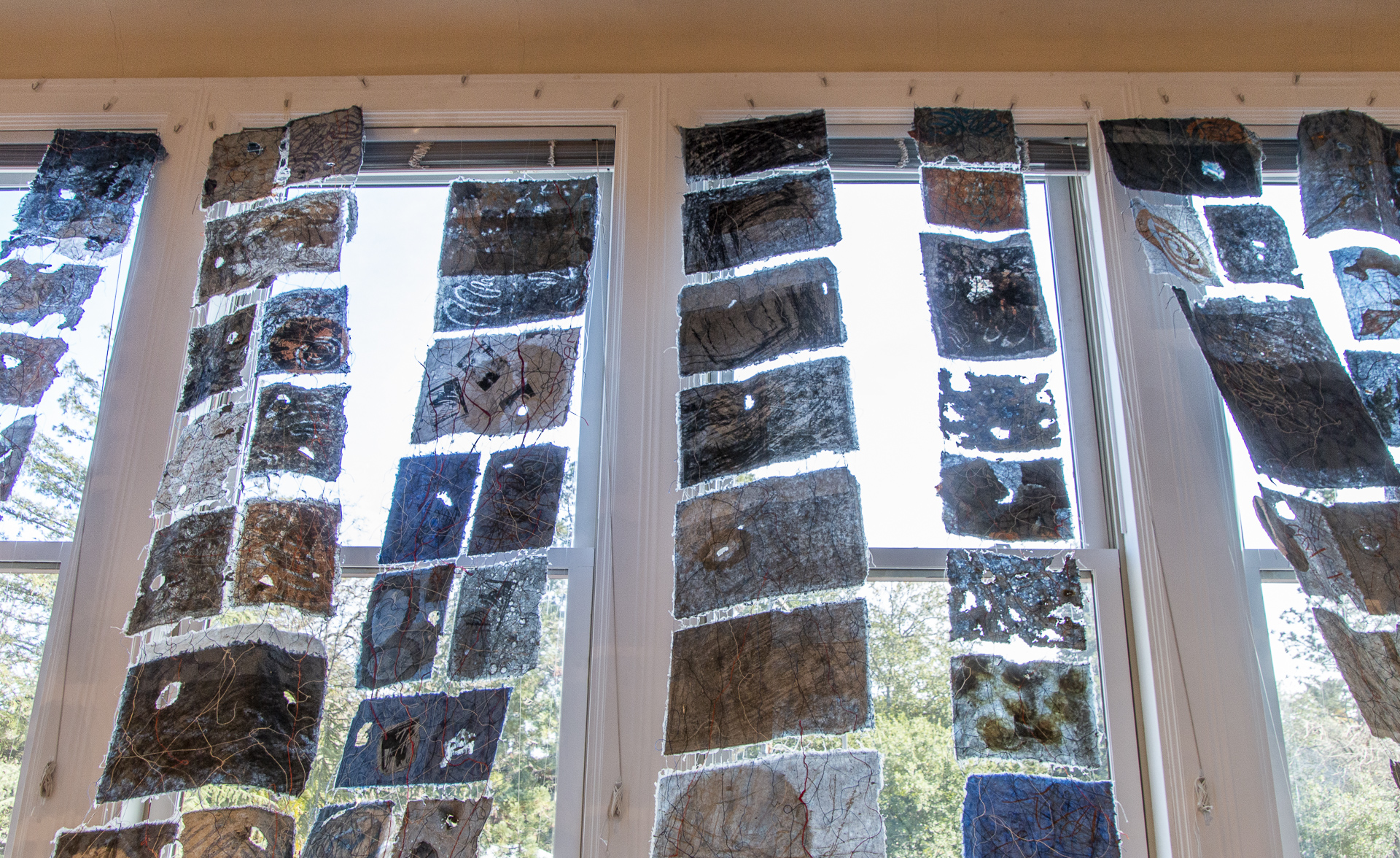 Everything changes when placed outdoors because of exposure to the elements and to the processes of nature. It is also vulnerable to interaction from people and animals. I decided that I would go with this flow and make art that consciously used the natural processes and human and animal interaction as a positive contribution to the artwork. I began designing pieces that were meant to change over time and be beautiful and evocative in all phases as well as contribute positively to the environment. I am using all natural and biodegradable materials such as branches, vines, handmade paper I make from local plant waste materials and seeds to produce continually evolving artworks. I also make indoor art installations of handmade paper, thread and other materials that are usually map-based and site specific created from materials I collect at a specific place and time to focus attention on the unique environment of that place.