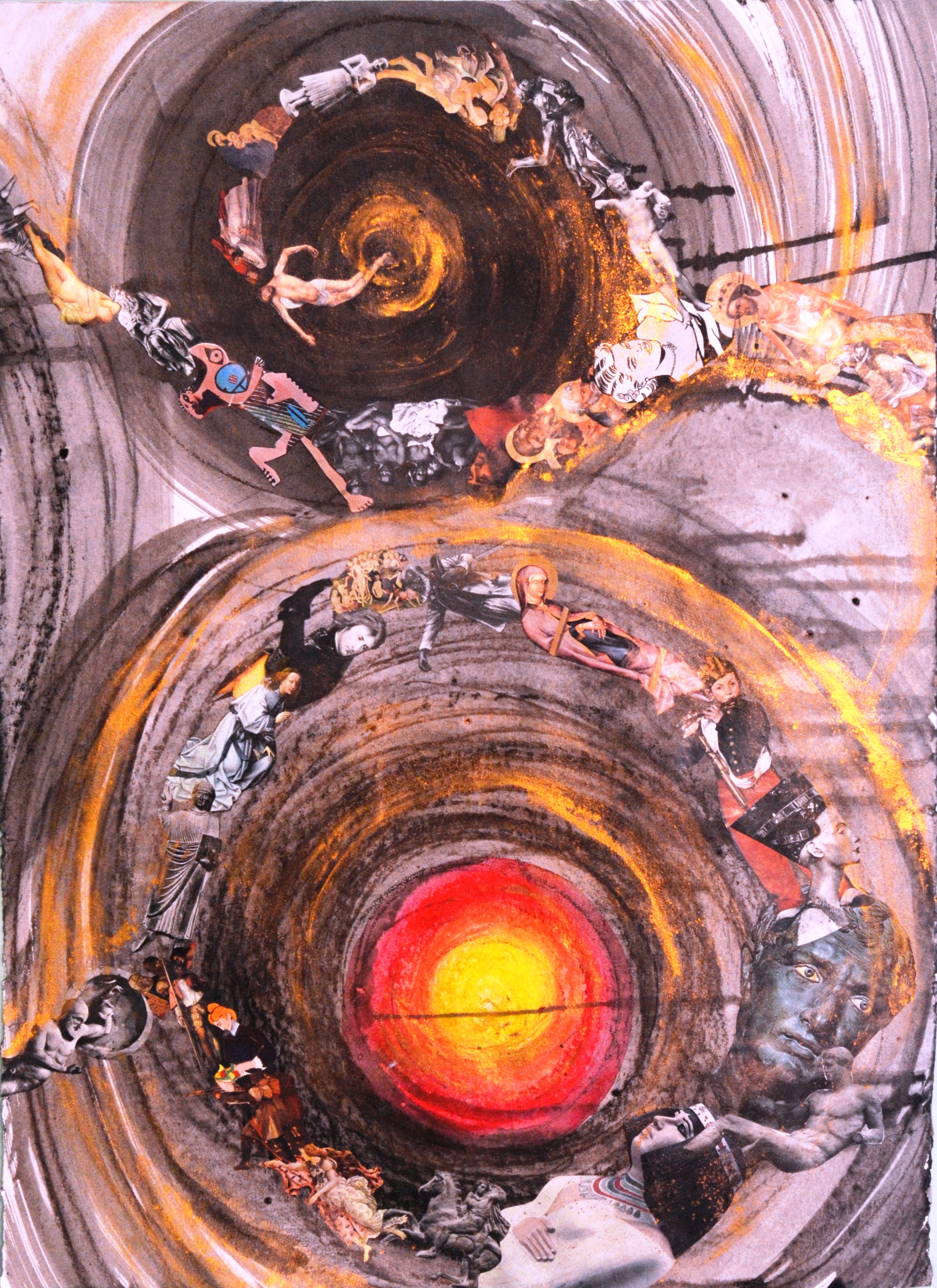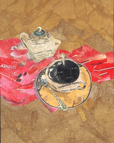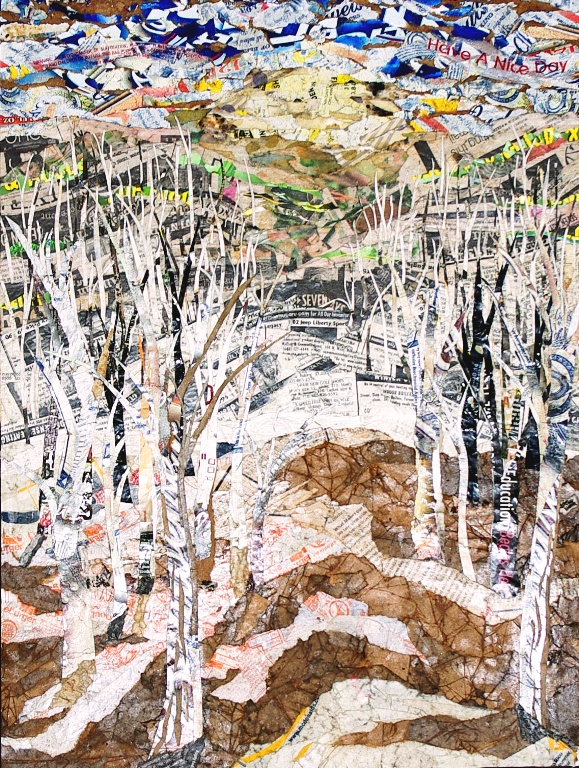 The Climate Change pieces are more spontaneous and somewhat abstract images of Vermont landscapes, many with organic rather than traditional geometric shaped 'canvases.' At first glance, they are pleasing natural compositions, which is belied by the manmade discarded waste from which they are constructed, as well as the underlying theme of ecological change in the landscapes they depict