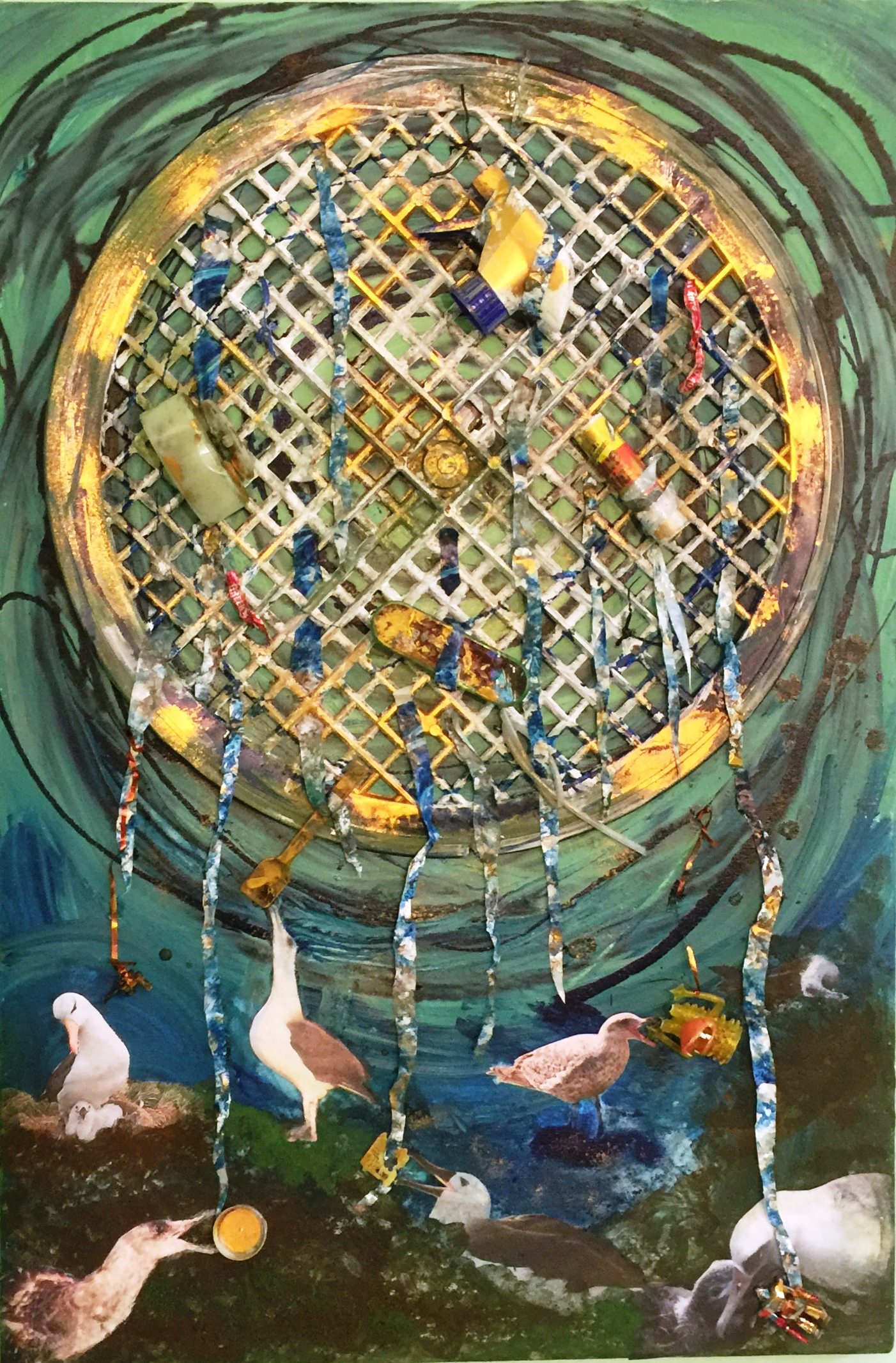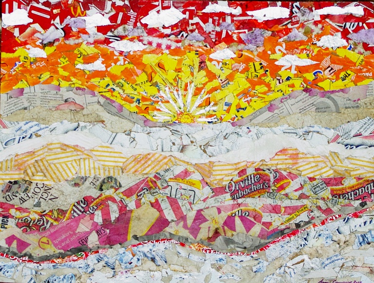 Anne's art is created using re-cycled, re-claimed, and re-purposed materials. The intent is to raise awareness about the volume of human waste we create, and its toll on places of natural beauty, even in a state considered as 'green' as Vermont. All the materials used to create Vermont Wastescapes, as well as the Local Food and Climate Change series were collected on the backroads and snowplow turnarounds from each of the fourteen counties of Vermont. Vermont Wastescapes is a large scale eco-art installation featuring images of natural areas from each county of Vermont.