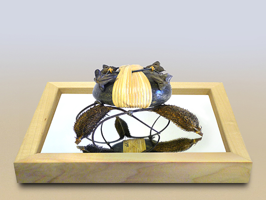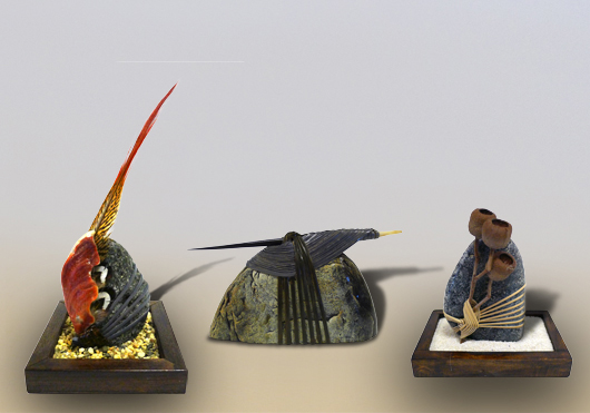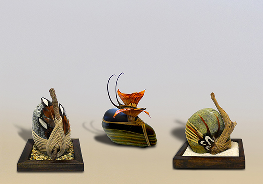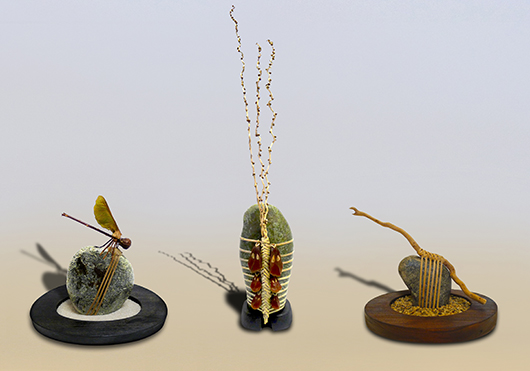 Her sculptural work includes intricate weavings that are created by using tension thus eliminating any need for adhesive materials. My art is elementary in the sense that I use common objects such as rocks and botanicals.
