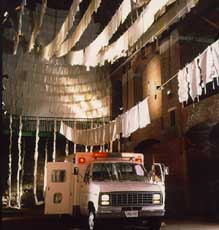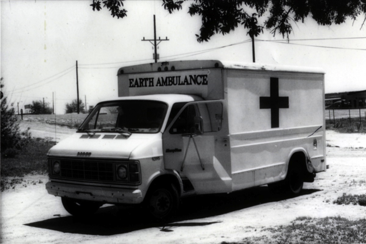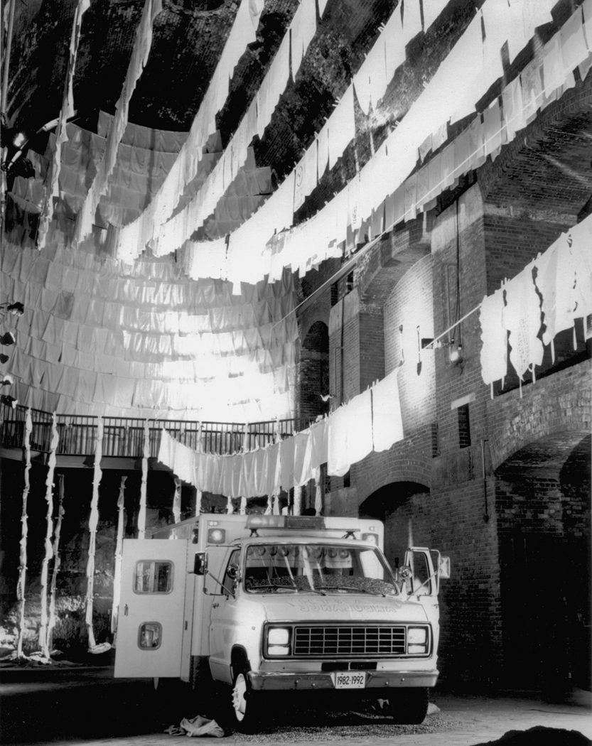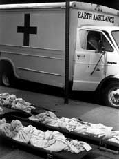 The Earth Ambulance has found a permanent home in the Hudson Valley Center for Contemporary Art, Peekskill, NY. The Earth Ambulance installation recalls the 1982 cross-country voyage to military sites that originated in Berkeley to 'rescue' the earth in women's pillowcases. These pillowcases were shown in long knotted lines on the facade of the Berkeley Museum in 1995, and now have been acquired for the permanent installation surrounding the Ambulance. Other pillowcases later exchanged with survivors of the A bomb in Japan and with women in the Soviet Union and at the Seneca Women's Encampment at that army depot, were also knotted in long lines in 2006, covering the American University Museum in Washington DC.