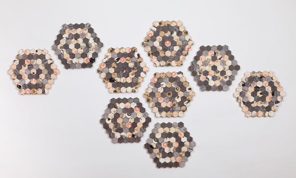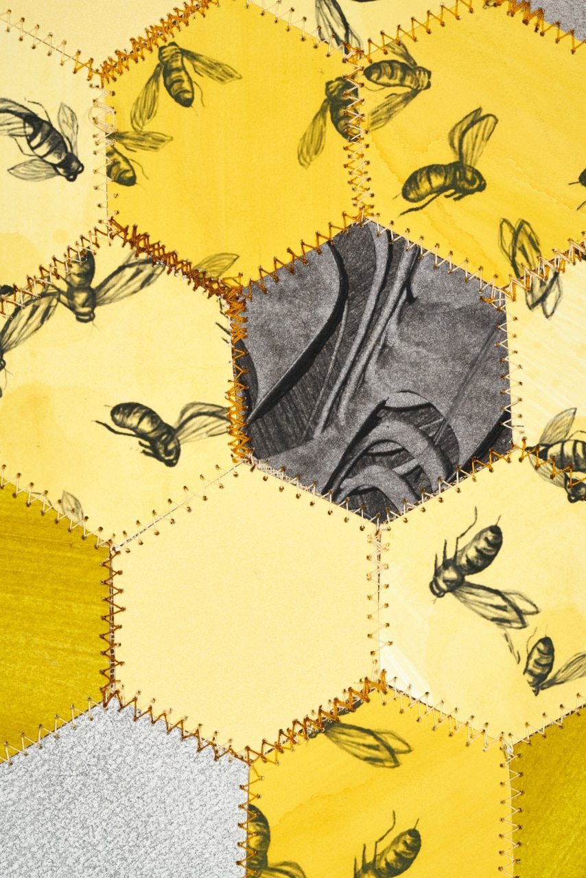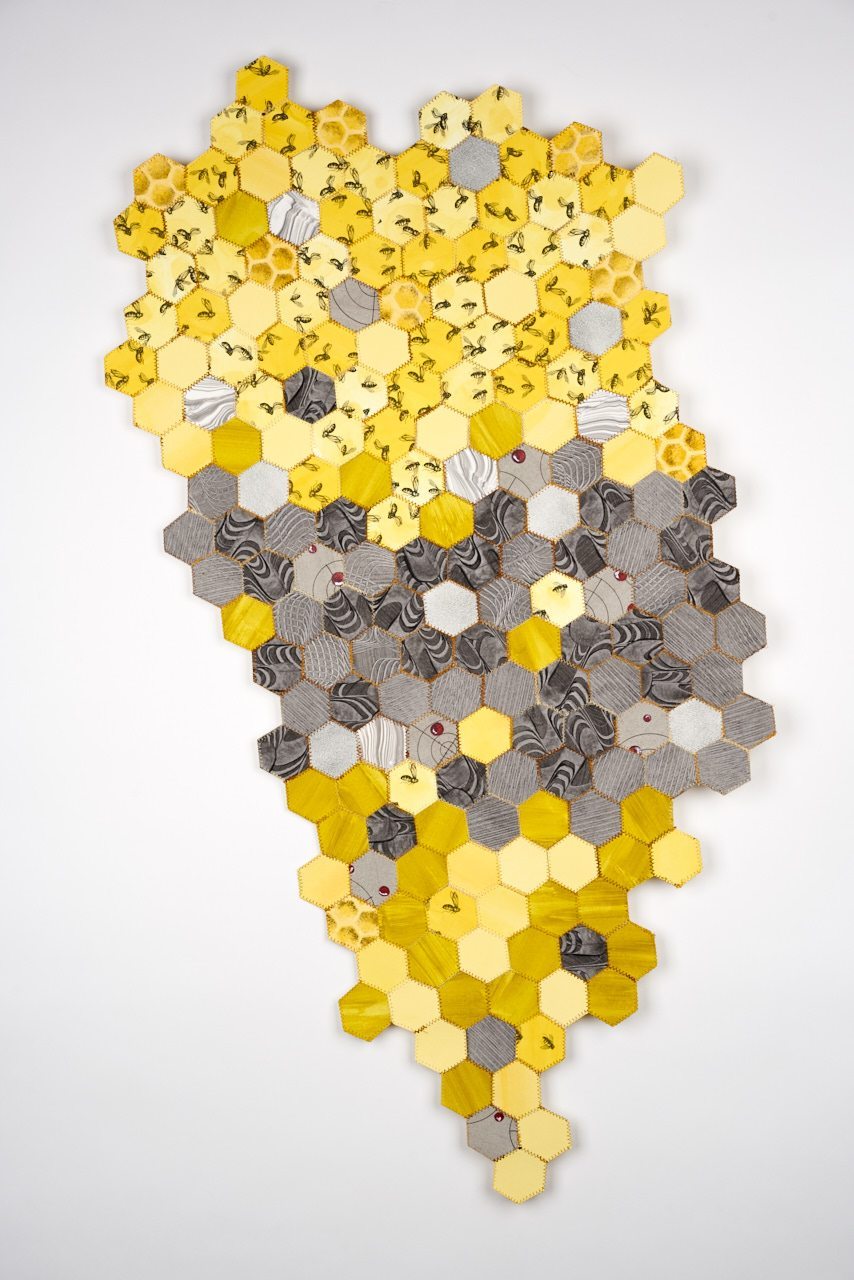 Through quilting, women have told many stories. They have told stories of where they lived, what they had, how much they had and who they were. They told stories of abundance and refined skill, to scarcity and survival. In my piece based on quilting traditions, I am telling the story of the times in which I live and of a great ecological disaster taking place, the phenomenon of colony collapse disorder. Through color, density of pattern and content I am graphically decrying the loss of pollinators and hinting at the grey future ahead.