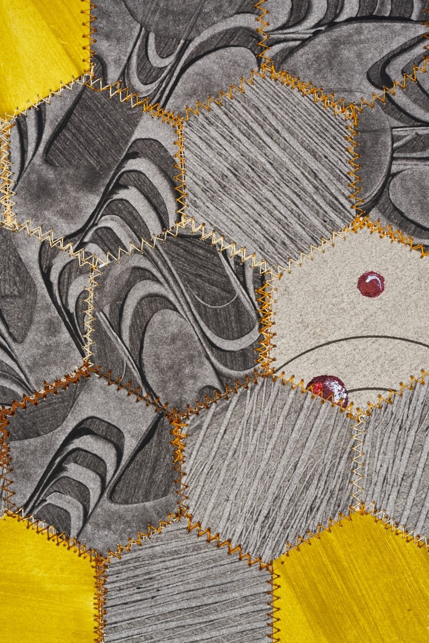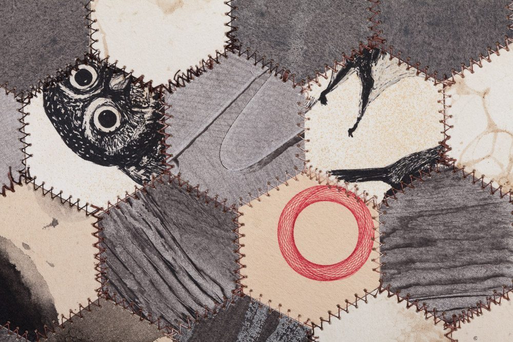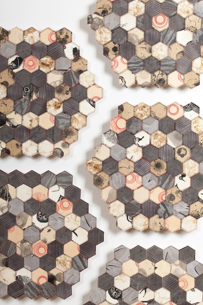I sew paper as a way to reinterpret and explore the continuing value of handicraft traditions in our times. I start with blank printmaking paper on which I create designs, repeat pattern and random, using a variety of media. Then I cut the paper into shapes to find a new layer of design. To assemble the pieces I sew them together into new constructions, drawing upon quilting patterns.