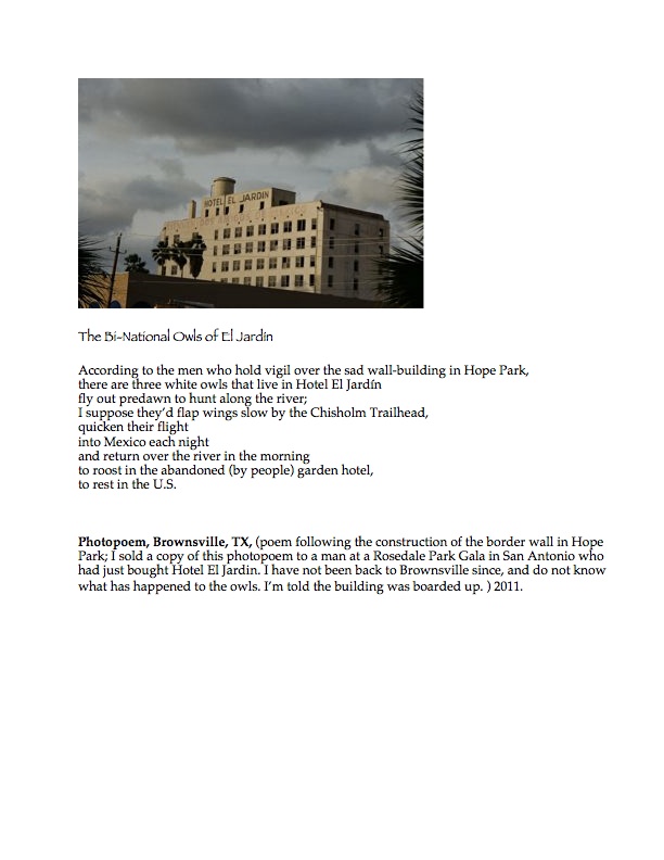 Kamala Platt, Ph.D., M.F.A. is adjunct profesora, artist, independent scholar and author in South Texas and at The Meadowlark Center, Kansas. Publications include: Weedslovers, Finishing Line 2014; On the Line, Wings Press, 2010 & Kinientos, (compiler) Wordsworth, 1992. She has shared her visual and performance art and poetry broadly, most often in community arts and cultural centers.