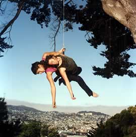 In both site-specific and stage performance, I choreograph on steel objects. I work with flight as an expressive medium within a social or political context, where the artistry of spinning, flying, and exquisite suspension is inlaid into a political intent. With my company, Flyaway Productions, I have choreographed for a three-story fire escape, a hanging umbrella, a circling merry-go-round, suspended containers of salt, spinning flour sifters, and flying poles. I have also made dances for rooftops, building walls, a construction site and the last remaining hand-operated crane on San Francisco's waterfront.