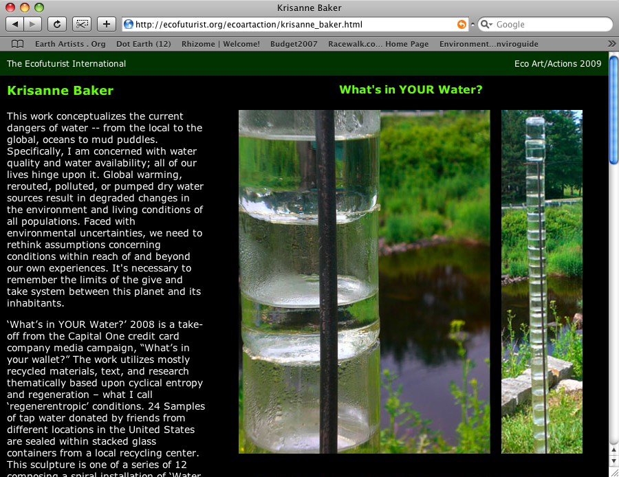 Krisanne Baker's ecological work and activism focuses upon water - water quality, availability, and rights. Her multimedia works and installations are created from mostly upcycled materials (often with site specific water samples) and with the intention to raise awareness about issues concerning water; specifically on the effects of pollution and climate change sea level rise, ocean acidification and the current unbalancing of the natural food web. Baker likes to reel in her audience, luring viewers with the beauty and fascination of water. But often upclose examination of water quality samples and cultural practices reveal to the viewer a horror. She works in short experimental film and film performance, installation, and painting medias.