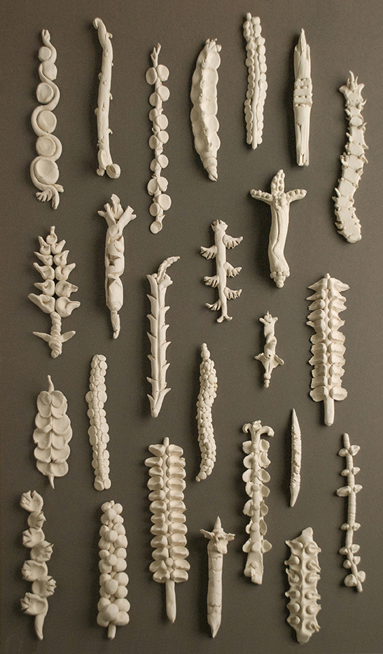Through the authority of the object, constructed in clay or in recycled and repurposed foam core or polystyrene, she addresses issues of the human condition and the natural world, often commenting on food issues from farmers to GMO's.