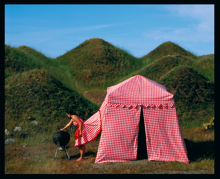 By referencing modes of female representation such as 'bare foot and in the kitchen' in the Picnic Dress Tent, or 'mother nature' in the Greenhouse Dress Tent, the dress tents simultaneously utilize and address a history of fantasy associated with women. Through pop-culture humor, the Picnic Dress Tent examines our recreational activities in the landscape though playfully familiar scenarios that leave us to question and reexamine our flow of routine and our relationship to the body as site of cultural desire. A play on green house gasses and what it takes to be "green" in contemporary culture, the Greenhouse Dress Tent becomes a commentary on the current fashion of being 'green.'