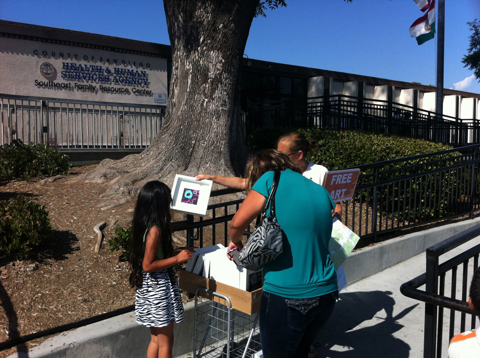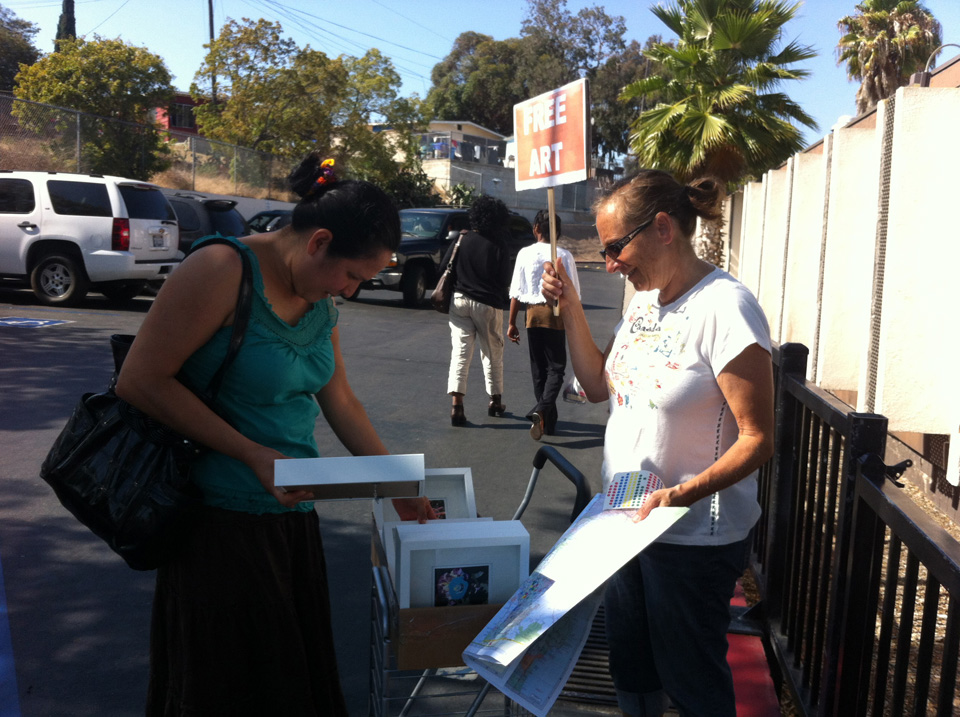 Awhile back I became very conflicted about making art objects, the environmental impact this has, and storing these objects. As I pondered this I also started thinking how there are many people in our society that have not had any, or much, exposure to contemporary art. That there are many who do not have original works of art to live with, to experience in their own environment, and how maybe having art in their homes might be of benefit. This brought me to doing the project 'free art: cart'. With this project I go to neighborhoods of mid to lower income, and give away original works of art, framed, ready to hang on a wall. Free art has morphed into other free art projects specific to an event. Often times I am told how generous this project is, which it is, but it is also selfish on my part. I can keep making art without the guilt of having it sit in my studio, feeling like it is an environmental waste, people seem genuinely excited about getting a piece. Over and over again they will thank me and I always thank them for giving my work a home.