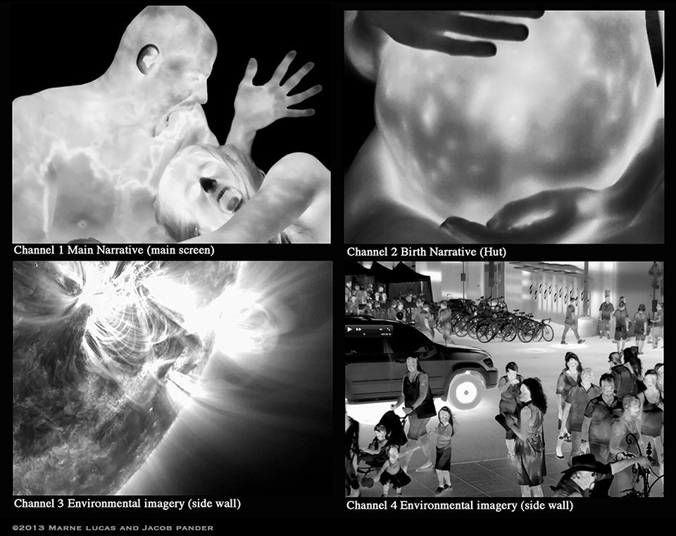 An infrared video pioneer, Lucas uses heat-sensitive imaging technology in the 'Transmundane' series to reference the magic and fragility of human existence and transport the viewer to an “otherworld” space within the framework of art and science. 'Transmundane' is a series of infrared thermal (IRT) video, photography and 2D works that frame the luminous energy of the human body, so that one may sense that we are truly beings of light. In stark black and white experimental films and digital photography Lucas has filmed the emotions and events of human life cycles, landscapes and water conservation, a live hospital birth, the hormonal change of Menopause, and implied death and transformation.