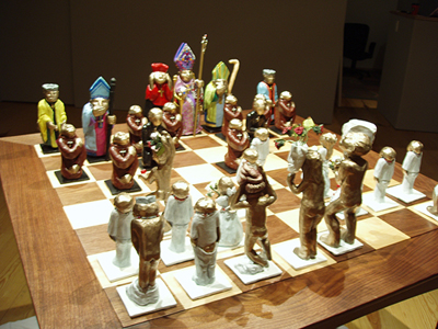 "Communion " & Communion II" . a bronze chess set & paintings that mirror the power & terror within this male power structure