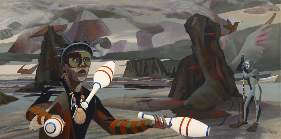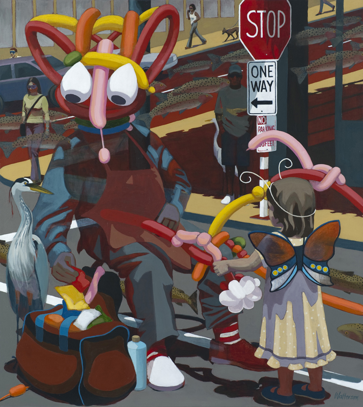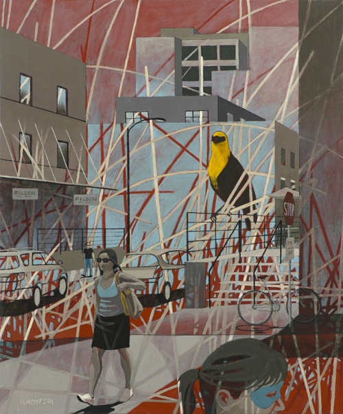 My compositions often use urban environments and man-made structures as a framework for contrasting nature with modern society. Masks, birds, fish and other symbols connect people and ideas through time and across cultures. At subatomic levels humans are not separate from earth, sky or stone. I explore these links by deconstructing perspective and plane and reconstructing the space. Realistic imagery in unusual settings and combinations creates an unconventional dream-like reality with mysterious and irregular perspectives that defy common visual logic. The eye sees it one way, but is that what is really there? I superimpose multiple landscapes resulting in a quasi surreal world where the human and the natural world occupy the same space with surprising effect. As a result there is surprise and sometimes whimsy and humor in my work overlaying more serious questions.