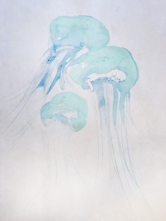 Encaustic Monoprints of Jellyfish and my Marianna Trench series celebrate some of the endangered species of the oceans.
