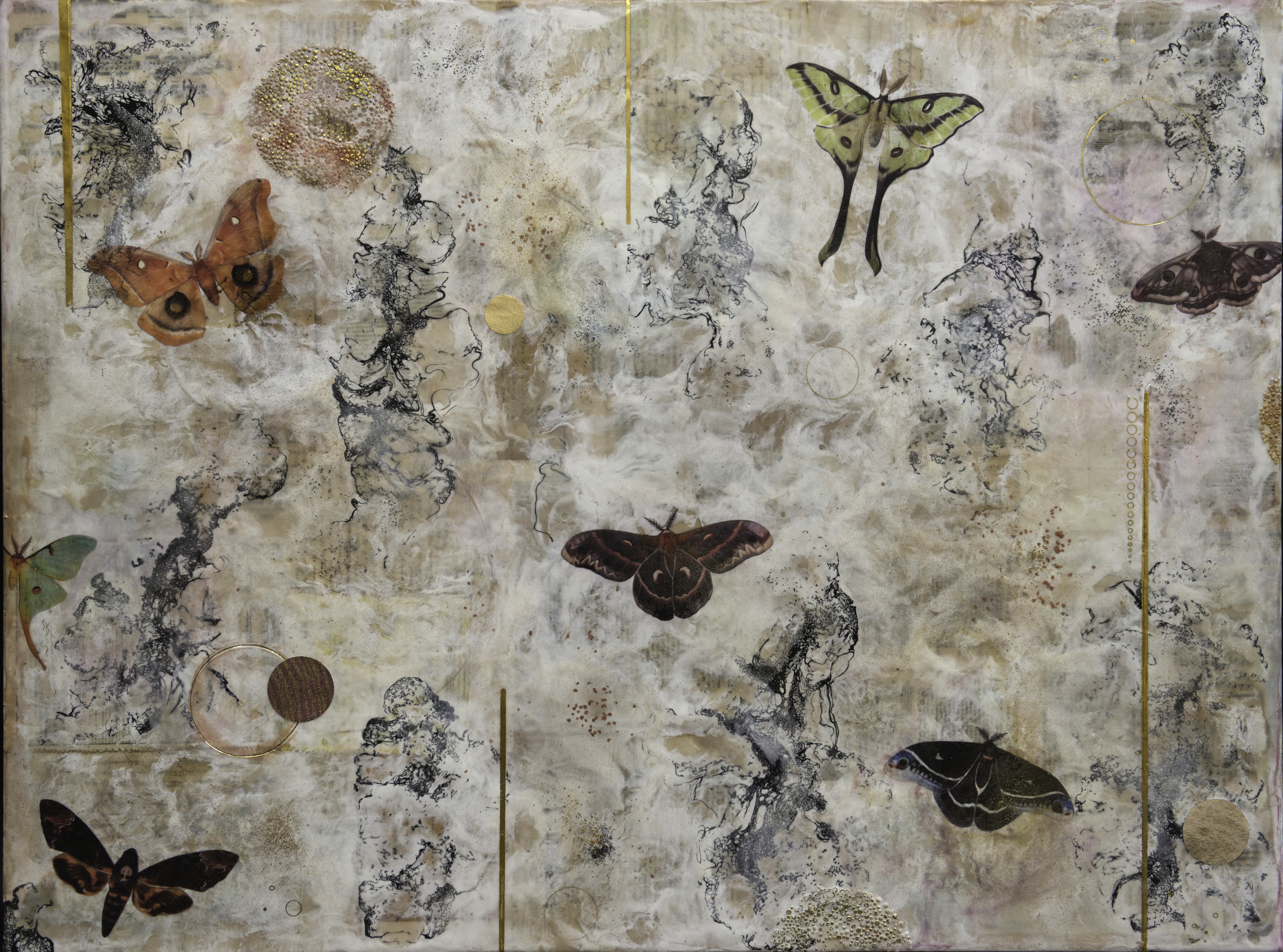 Molten bees wax, old books, letters, maps, & ephemera filled with memories. Inspired by the briefness of life and the wonders of the natural world Amidon's artwork explores the cycles of life, calling attention to its transitory and fragile nature. Shannon primarily uses the ancient medium of encaustic (molten beeswax) often incorporating organic and ephemeral materials to create her artwork. She has a strong emotional connection to well-worn objects that have been through many hands and feels the essence of their history and memories reflected in her art. Her subject matter often includes a variety of natural history elements including insects, botanicals, seed pods, and birds as well as ancient symbolism and geometry. By interlacing science, nature and memories Amidon strives to create pensive and familiar images that transport the viewer to another time and place, evocative of a moment filled with exploration, wonder and discovery.