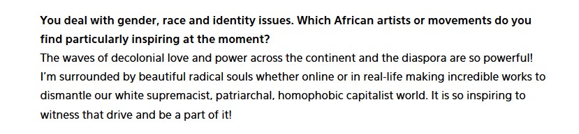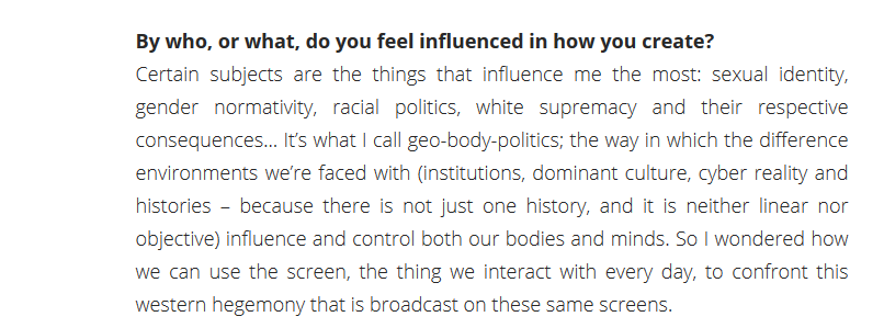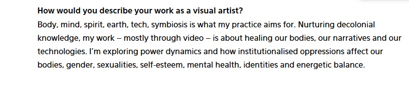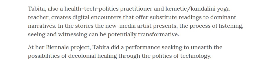 Navigating digital, corporeal and ancestral memory as sites of struggles, she digs into scientific imaginaries to tackle the pervasive matrix of coloniality and the protocols of energetic misalignments that affect the songs of our body-mind-spirits. Inspired by quantum and cosmic mechanics, Tabita's work is rooted in time-spaces where technology and spirituality intersect as fertile ground to nourish visions of connection and emancipation.