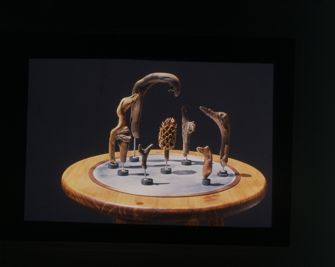 The interactive sculpture, 'SURVIVORS' made of driftwood, magnets, and Douglas Fir, creates a metaphorical endgame: we are all different, but also the same; we share a finite space; let's try to find ways to live together.