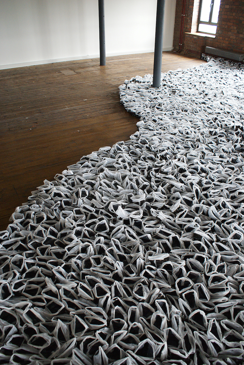 Previous installations have included 132,000 plastic knives and forks, 7500 ice-cream containers, 45,000 carrier bags, a selection of trees from Ash to Silver Birch as well as a reproduction Las Vegas sign.