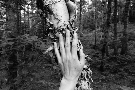 Her works are collaborative with land, grasses, trees and water. In Sleeping Places, Newfoundland (1982) a series of photographs documents the traces of Creates’ body on the land, in the long grasses where she slept on a walking tour. Her most recent work is a deep collaborative interchange with the six-acre piece of land where she now lives, coming to know it ever more intimately through the process of being with, listening, walking. She speaks of coming to know individual trees, of the ever-increasing depth of relationship between self and place. Recent and ongoing work Larch, Spruce, Fir, Birch, Hand, Blast Hole Pond Road, is a series of photographs of the hand of the artist resting on different trees, where the sameness of the hand reveals the individuality of the trees. The gesture demonstrates acknowledgment of both difference and relationship.