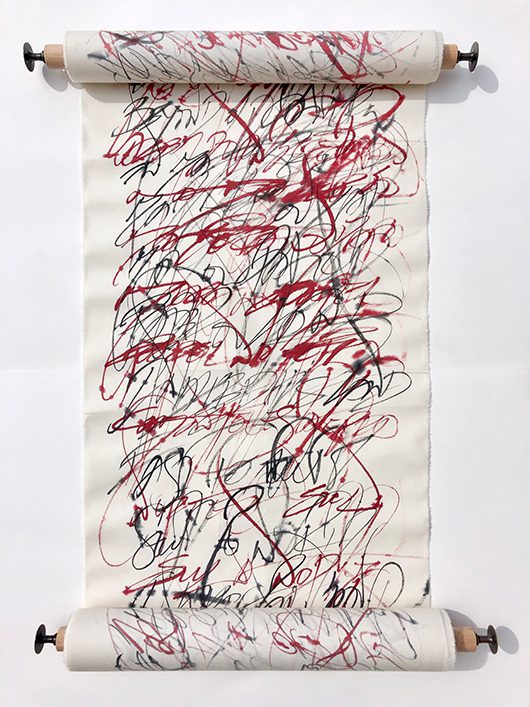 ETERNAL FOREST MANIFESTO, Ink on cotton fabric, wood and metal fixing, 57 x 2200 cm, Unique, 2019.