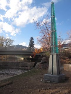 The seed was formed earlier in the early 2000s. I often talked with Dad about ways I could contribute my artistic skills to flood education. We agreed that a visual form creating visceral experience of the projected 16-18 foot high potential flood levels in down town Boulder might be useful. I built him a little model for a stacked glass and stone flood level marker that Boulder Creek walkers could stand beside, look up, and understand the magnitude of flooding. It could also serve as a flood warning, and the signage would educate viewers to get to safety within the projected 45 minutes warning.