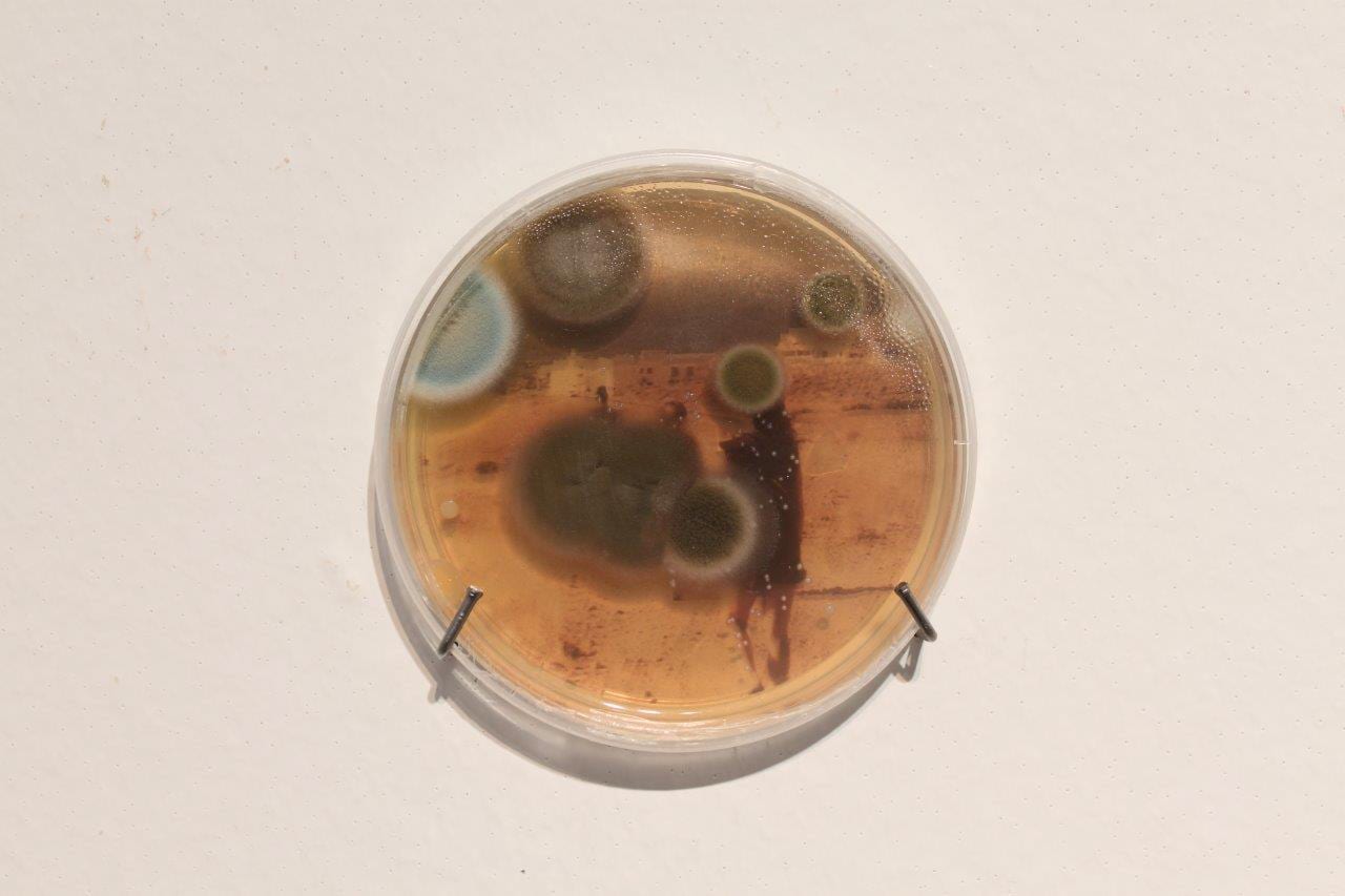 Following the safety protocols in the laboratory to avoid any kind of environmental contamination, mushroom proliferation being very frequent, some plates have rapidly developed fungal spores that will continue to grow until the images are “erased.”