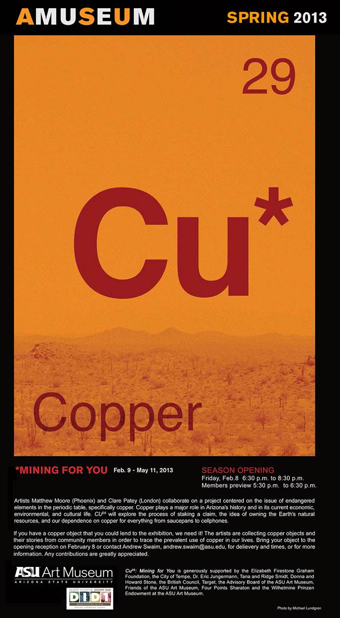 Collaboration between Matthew Moore and Clare Patey on a project centered on the issue of endangered elements in the periodic table, specifically copper.