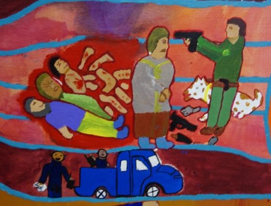 The highway ends. A hole opens in the land. A man is about to execute an unarmed woman. Behind them a pile of body parts is guarded by vicious dogs. A blue truck brings more victims to the same unmarked location where everyone will be killed. These are men, women and even children who were unable to pay ransom to Narcotraffic cartels that control the Mexican side of the border. If they do not pay, they lose their lives. The young man who painted the execution scene and the pile of decomposing body parts had to add very little to his imagination to produce a painting devastatingly truthful. He had been there. He was forced to cut up the dead bodies to feed the dogs. Failing to do so would have cost him to be decapitated. Unimaginably, he escaped. He ran and walked, got lost and got disoriented. He knew that he had arrived at the United States when he was arrested by the US Border Patrol. The violence he escaped from his native Guatemala had brought him to El Norte. He had never imagined that he would end up in a prison. He was now trying to figure out what would happen to him next.