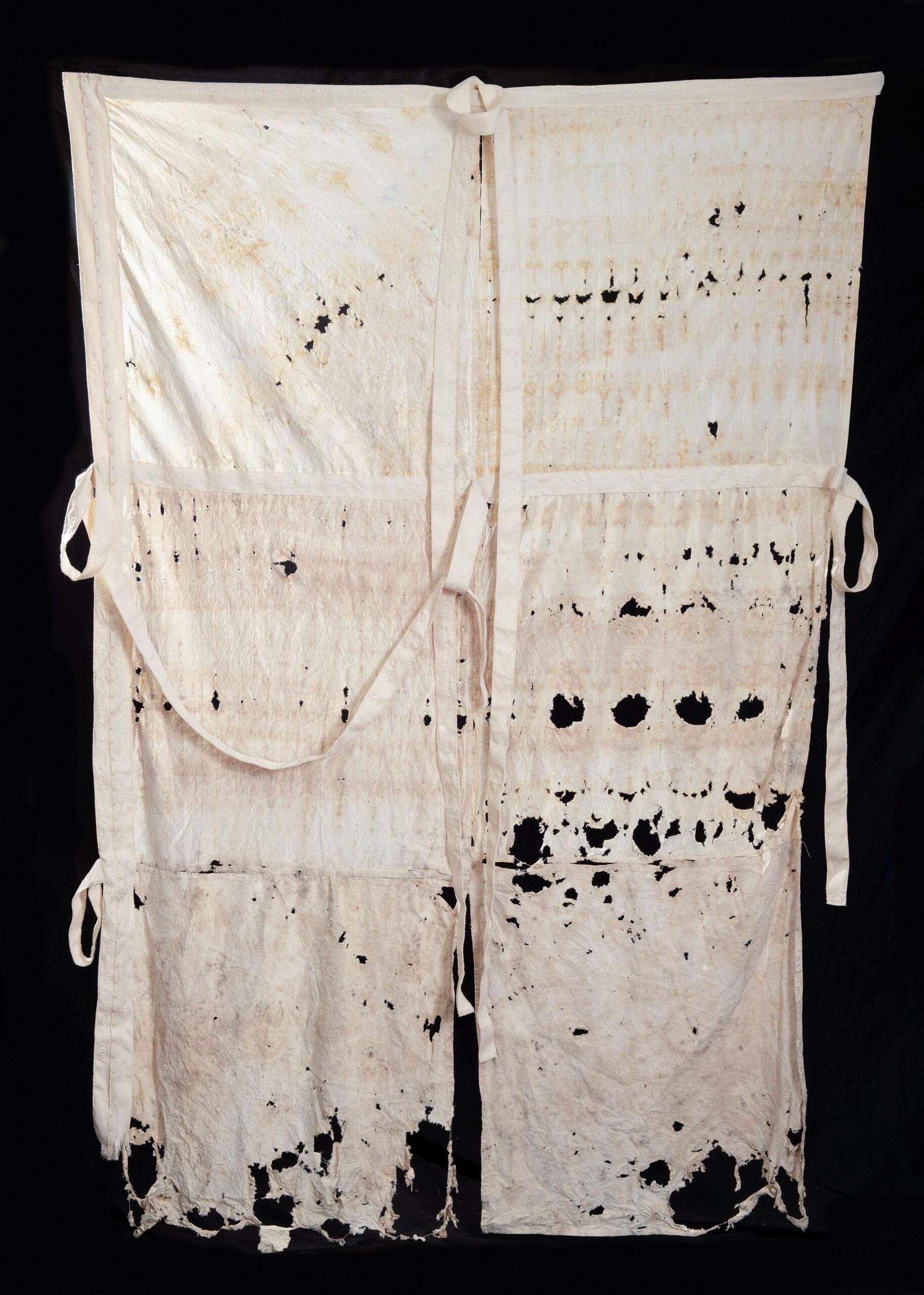 I contributed a traditional burial shroud, made by hand-stitching several pieces of the buried cloth (Figs. 14 and 15). The cloth had been buried in the Pacific Northwest. The cotton twill bands, with traditional loops for enclosing the body, have white-on-white embroidered text. A few lines from the extensive text, embroidered on the shroud, read: