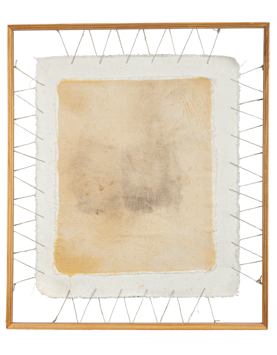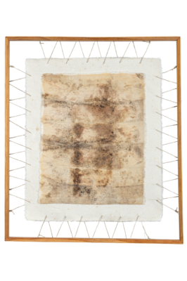 Fig. 13: Rooted, Saskia Jorda, buried and unearthed canvas, thread, cotton fiber, cotton twill tape, ink transfer, 5″ h x 24″ w x 24″ d, 2024. Photo: Grey Shed Studio