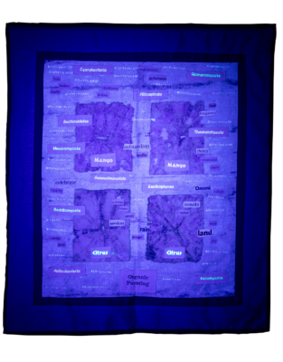 Making the invisible visible was one goal in the piece, Signs of Life (Figs. 8a and 8b). In it, cloth buried in the organic fruit experiment in Oman was sewn together and labeled with the names of some of the microbes present. The labels were made of UV light-sensitive thread and ink, so the names can only be seen if one has the UV light with which to see it.