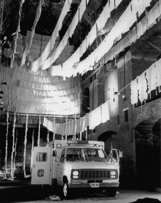 In 2004 Bridge of Knots 1 (the initial pillowcases from the cross country sac/SAC voyage) was acquired by the Hudson Valley Center for Contemporary Art in Peekskill and hung with the installation of the Earth Ambulance ’82-’92- ’02. This Earth Ambulance contained blank pillowcases (as a Tabula Rasa). The surrounding pillowcases that were stained with rain and earth and wrinkled and torn contrasted with the blank sterile starched white pillowcases of the future that we do not know as yet.