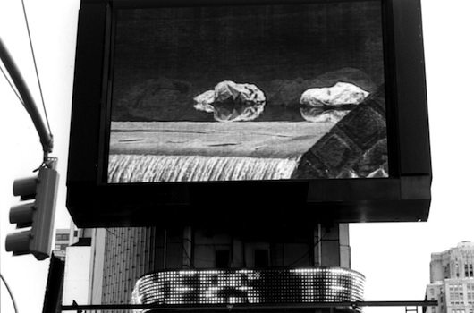 In NYC, a two-minute clip of the video of the 1985 River journey was screened hourly in 1995 on August 6th, Hiroshima Day and August 9th, Nagasaki Day on the Times Square Jumbotron. The question is posed to the hurrying passersby carrying an attaché case who might take a second to look up at the screen: ‘What would you take, what would you carry in your sac?’