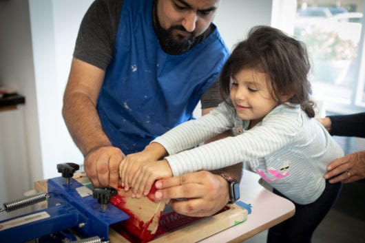 - MOAH Marroquin Family Classroom – Tote Bag Screen Printing. Coinciding with a weekly Farmers Market on The BLVD, artists Nuri Amanatullah and Clovis Blackwell helped participants add the #CountMeIn logo to a screen printed tote bag design created by Clovis. MOAH staff and a colorful sandwich board sign stationed at the corner helped draw a steady stream of market-goers into the street level space for a quick census briefing as they chose their ink color, pulled their own squeegee across the screen, and headed to the market with a freshly printed tote bearing the #CountMeIn message in that most democratic of mediums, screen printing.