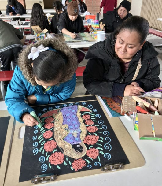 - Sacred Heart Church – Virgin of Guadalupe Chalk Drawing. Building trust with this mostly Latinx, Spanish-speaking demographic at the largest church in downtown Lancaster was a crucial component of the larger #CountMeIn initiative. As Robert wrote, ‘This community has been particularly affected by anti-immigrant, racist, and anti-Spanish speaking sentiments contributing to the politicization of the Census, a climate based in fear, and an ongoing misinformation campaign. Fears of Census data leading to mass deportations became increasingly real and still persist. These fears stoke undercounts of Latinx people in the Census, adversely affecting their communities ‘7 Therefore, we wanted our engagement activity to honor the community’s own traditions. Accordingly, we organized a drawing event during their saints’ day celebration for Our Lady of Guadalupe, patron saint of Mexico. Families used colored chalk on black paper to create their own powerful interpretations of the Virgin. Hung clothesline art show style for the MOAH exhibition, the drawings testify to the strong faith of their makers.