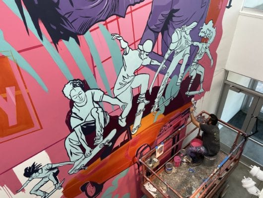 Nuri Amanatullah paints Don’t Look Back, You’re Not Going That Way mural during COVID-19, Lancaster Museum of Art & History, Lancaster, CA. Photo: Andi Campognone.