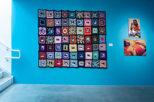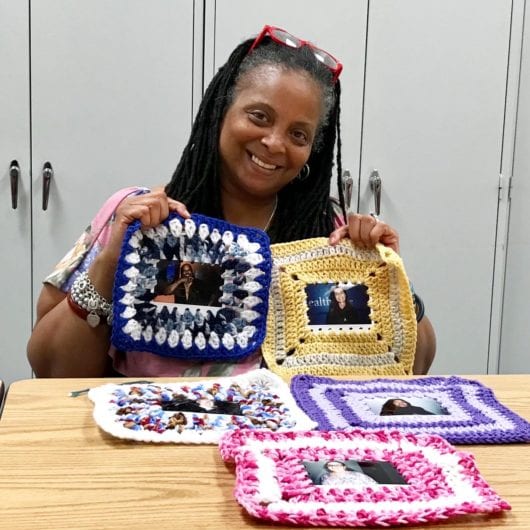 - Antelope Valley Senior Center and Housing Corporation of America – Crochet & Polaroids. This was my pet project, a long-term activation with two groups of women, one at the local senior center, and the other from three affordable housing communities in downtown Lancaster. Aware that seniors, especially if living in residential communities, often go undercounted in the census, I’d had the Center in my sights from the start, looking to do something there with the instant cameras. The first day sitting with the needlecraft class, it occurred to me that the rigid nature of the film might lend itself to being crocheted inside the centers of common ‘granny squares.’ I snapped and hole-punched some images and needlecrafter Marcella Jackson found a way to build granny squares around them. As folks at the Center learned of the project, they agreed to have their photos taken. I always made them one to take home, sharing the census story with each portrait. Marcella established herself as Lead Crocheter, and we marshalled other women in the group to crochet squares under her watchful eye. I loved listening to the buzz of women enjoying the camaraderie of that room as they worked.