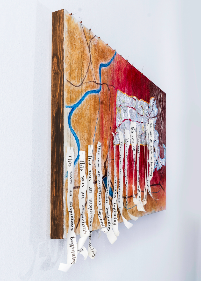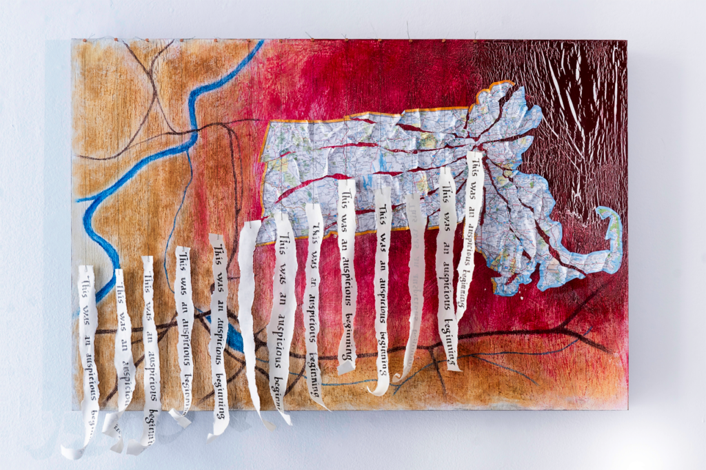 Materially, this work includes mixed media collages and paintings, sculptures, and installation art incorporating natural, familial, and found objects, along with torn historical and contemporary maps. I worked with threads, relics, and treasures handed down by my beloved late grandparents, dialoguing with them through time in the making. I sat with a great old oak associated with these histories, which involuntarily hosted a sign commemorating my ancestor until it was recently removed in an effort toward reconciliation. Its fallen leaves, twigs, and bark became a meditation on how the natural world herself is often forced to tell false histories. I allowed myself to perseverate on the phrase of the “auspicious beginning,” thinking about how intergenerational narratives are repeated to erase and proudly justify bloody histories. Writing this phrase on torn pages from my childhood drawing books, dyed with tea I created from the oak leaves, I aimed to begin a composting process which also unfolded through endless dialogue with my living family members and community. As such, this project is about disrupting false narratives and about holding myself and others accountable for telling, and acting upon, truer histories.