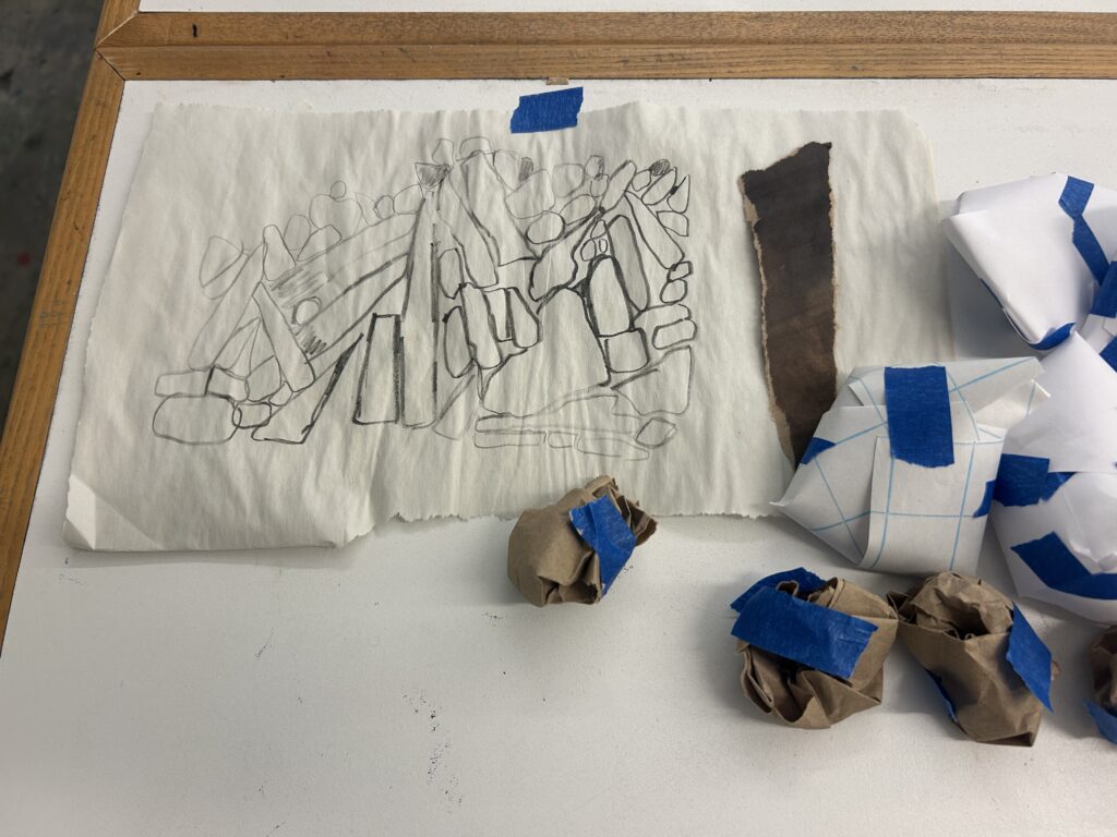 I participated in a winter residency at Penland School of Craft in North Carolina in January 2025. This transitional time allowed for material studies of my field learnings from the previous trail season. My work from the winter session involved explorations of stone with paper. The idea was to create paper versions of rocks to experiment with builds I had not yet been able to complete in the field, such as improbable stacking and archways. I painted colored washes on a variety of paper types using palettes liberally inspired by stones. I used papier-mache to create structural, stone-like objects. The reassembling of the monochromatic washes created quilt-like patterns on the rocks. It was important that these creations resemble stone but not mimic in entirety. I was further inspired by drawings in the book Listening to Stone by Dan Snow. I looked specifically to his depictions of rock walls on Inishmore, which are known for their simplicity and intentional lack of tightly packed mass. The geography of the area dictates the use of long, thin, geometric stone. The walls are assembled to maximize height to deflect wind but are porous to retain stability. The uniqueness of these shapes inspired the materiality present in my winter residency studies.