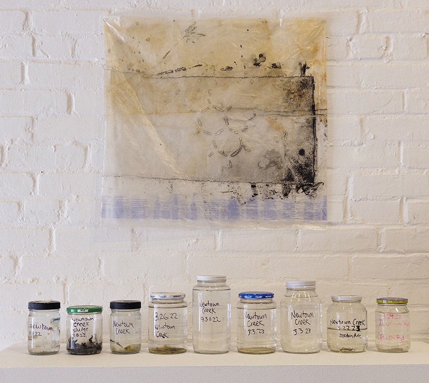 Samples (installation view on pedestal in this photo): dimensions variable, jars w creek water and sediment, 2023. Troubled Waters 14 (on wall): 16” x 22”, ink and pigment on plastic, 2023.