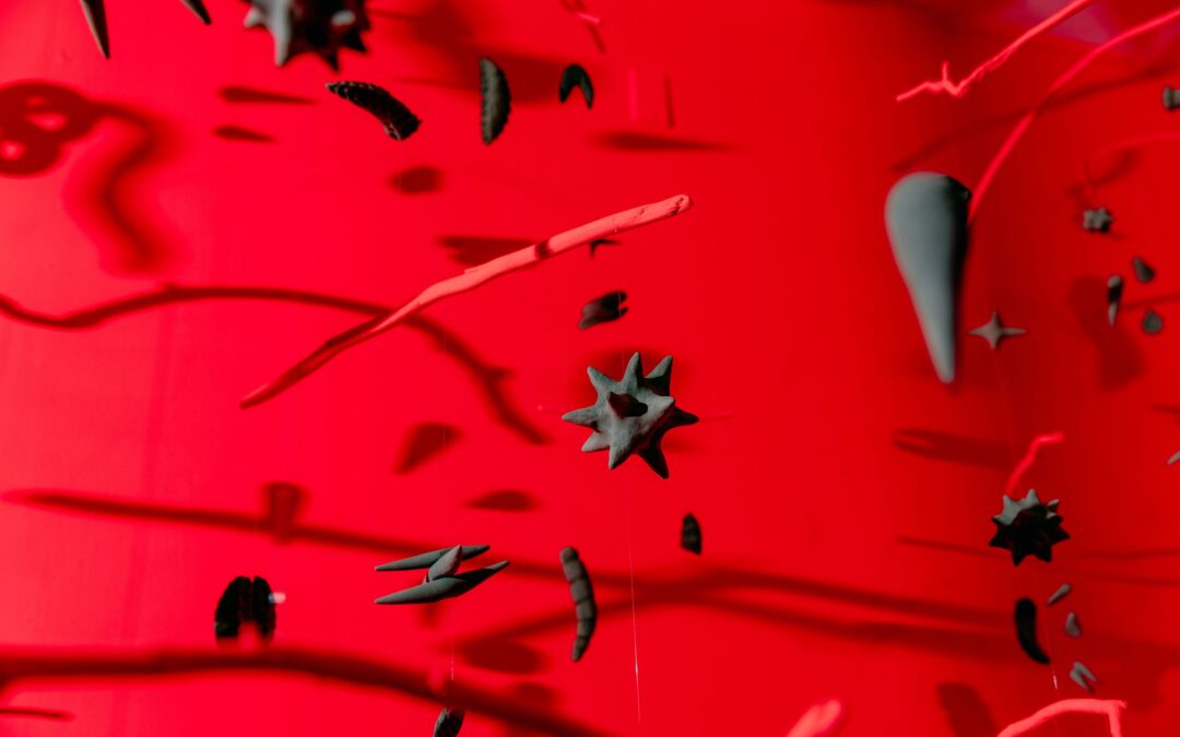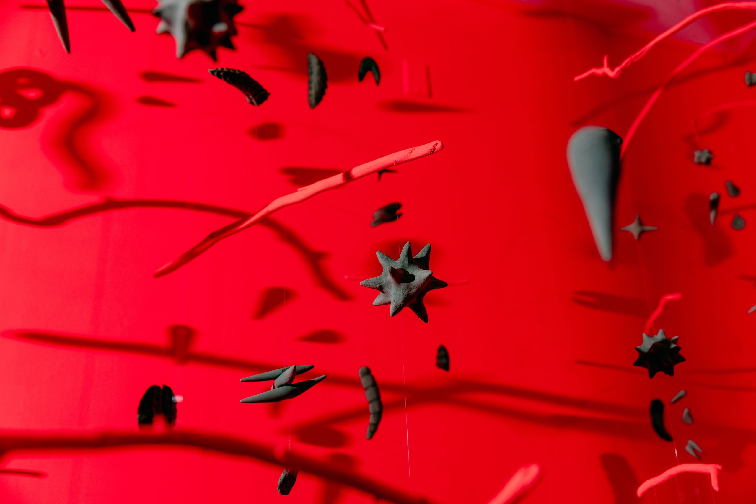 Mud Will Remember Us (detail), Tanja Geis, San Francisco Bay mud, fishing line, driftwood, oil paint, acrylic paint, and metal, 110″ x 96″ x 180″, The Guardhouse, Fort Mason Center for Arts and Culture, 2023. Photo by Andria Lo