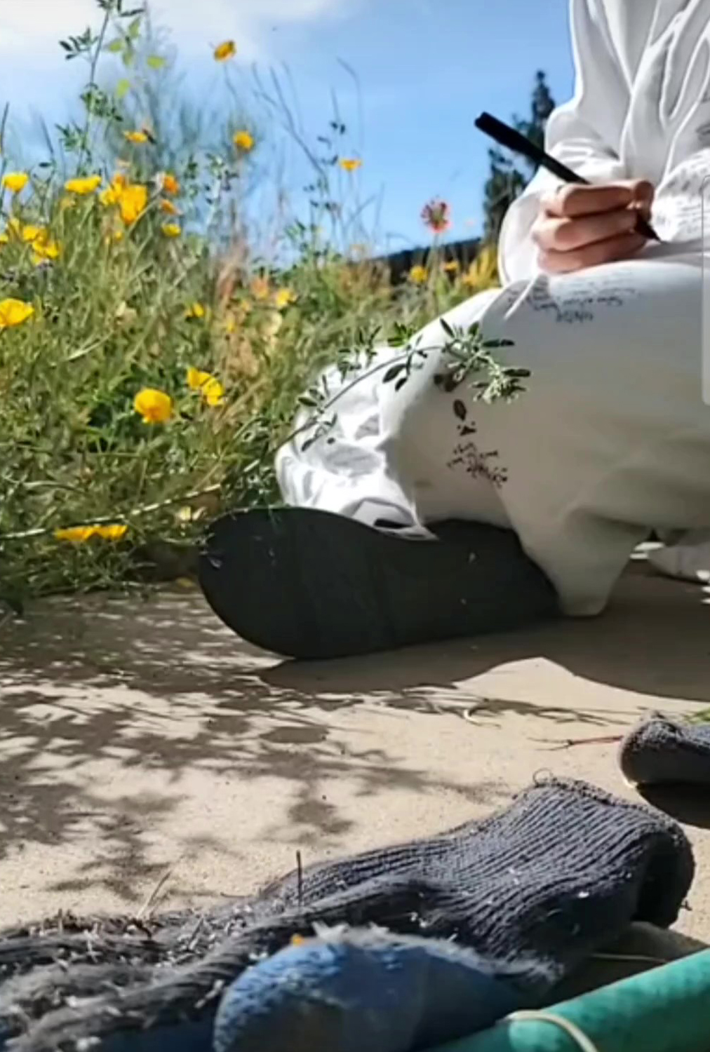 Leaving Land to Itself: Yard Work (work in progress), Jen Urso, white coveralls, pen dirt, plants, and sweat, 2023.